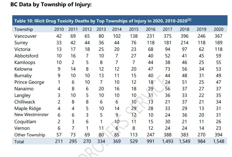 Only Vancouver (367), Surrey (189), Victoria (118), and Abbotsford (59) have reported more overdose deaths this year than Kamloops, while Kelowna has seen 53 deaths in the first 11 months of the year.