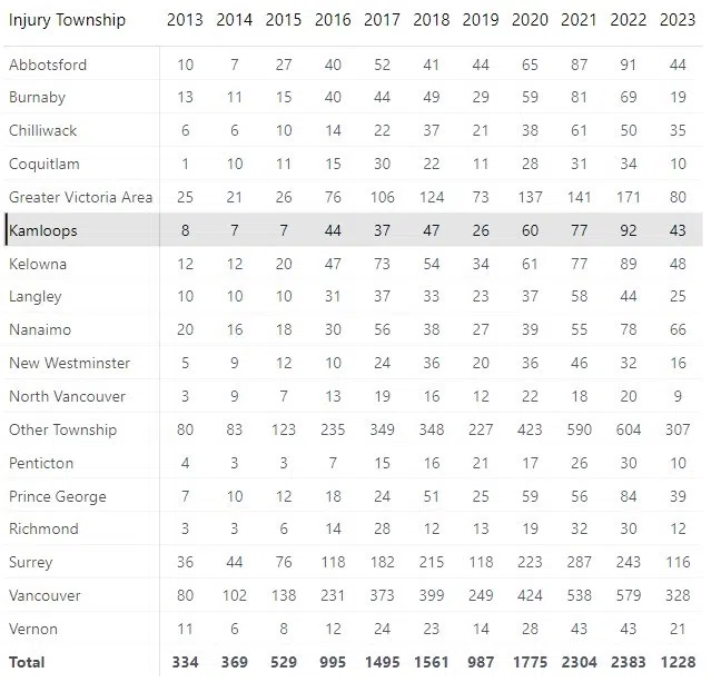 While this is down from the seven who died in May, Kamloops is still on-pace to surpass last year’s record total of 93 deaths.
