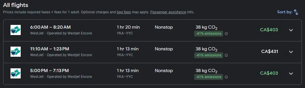 The three daily non-stop flights from Kamloops to Calgary as of Oct. 30, 2023. (Photo via Google Flights)