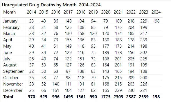 The Coroners say 14,024 people have lost their lives to unregulated drugs since the public-health emergency was first declared in April 2016.