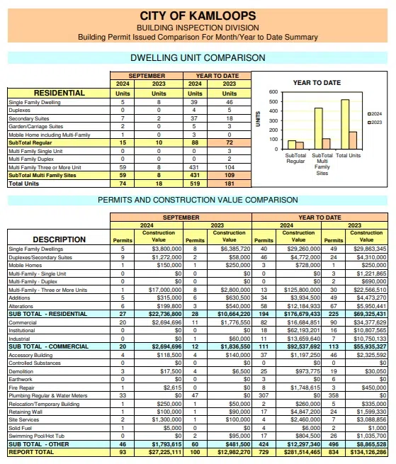Dixon says there was one project in particular that drove up those values in September. “I think the biggest project we saw was a apartment unit on Tranquille Road. A 59 unit building. That’ll have, or had, a construction value of $17 million. So that’s, by far and away, the biggest project of the month.”