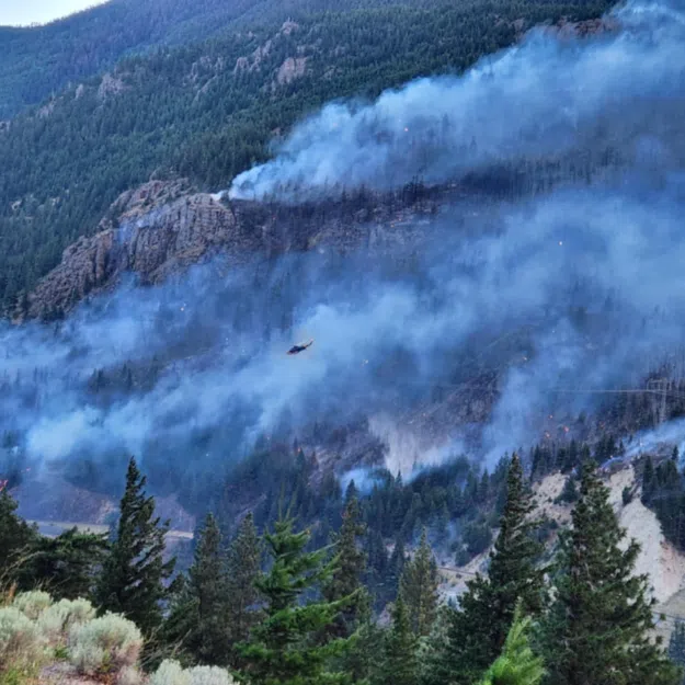 - The early hours of the now-named Cantilever Bar fire southwest of Lytton. A helicopter can be seen assessing the fire/via Tricia Thorpe