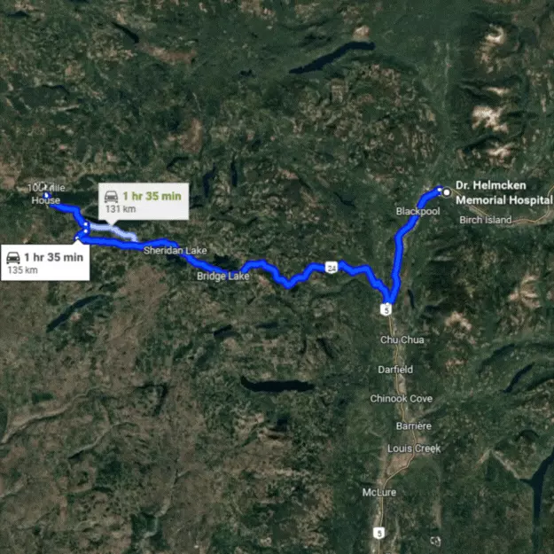 Maps displaying the approximate additional travel time people would have required this weekend in the North Thompson due to the shutdown of the Clearwater emergency room/via Google Maps