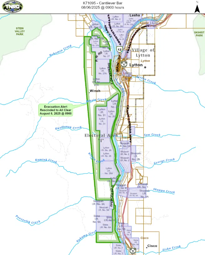 As of 9:00 a.m. on August 6, the evacuation alert issued for Spencer Road South in TNRD’s Electoral Area “I” (Blue Sky Country) has been rescinded to All Clear. This notice affects approximately five properties: