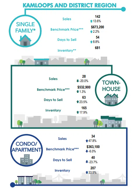 In Kamloops, benchmark prices reflected continued market stability. The single-family home benchmark price rose 2.2% to $673,200, while townhomes increased 1.3% to $532,900. The condominium market, however, saw a 6.0% decrease in the benchmark price, down to $363,100—suggesting a possible cooling in that segment.