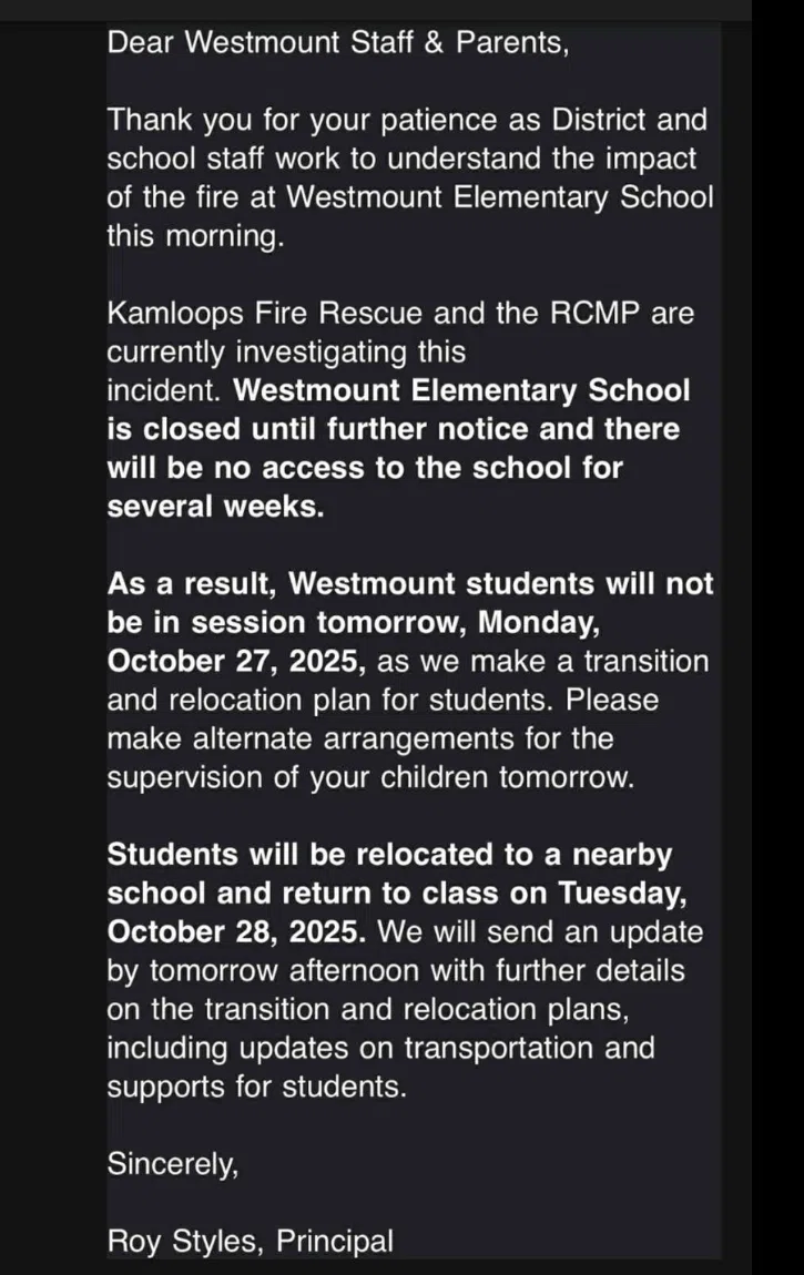 The Principal’s letter goes on to note that classes for students at Westmount Elementary have been cancelled for Monday as the District works on plans to “relocate” the students to a nearby school for classes on Tuesday.