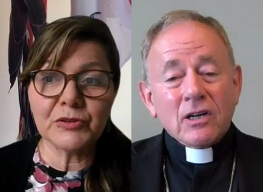 [CLICK TO EXPAND] Tk’emlups Kukpi7 Roseanne Casimir (L) and Vancouver Arch Diocese Arch Bishop Michael Miller (R), speak in online news conference detailing “Sacred Covenant” signed in March 2024/via Zoom