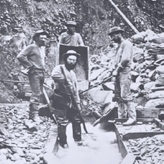 [CLICK PHOTO TO EXPAND] Prospectors sluicing for gold in the Fraser River during the mid-19th century Fraser River gold rush/via Westhaven Gold
